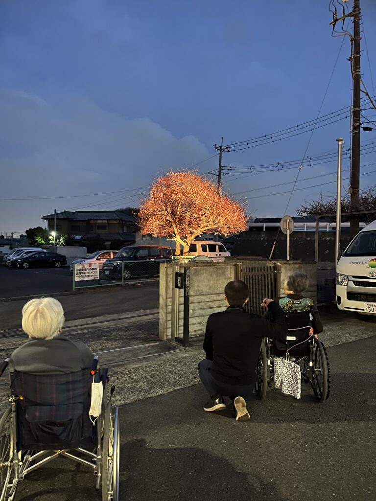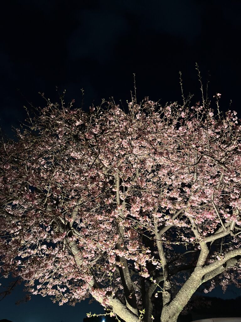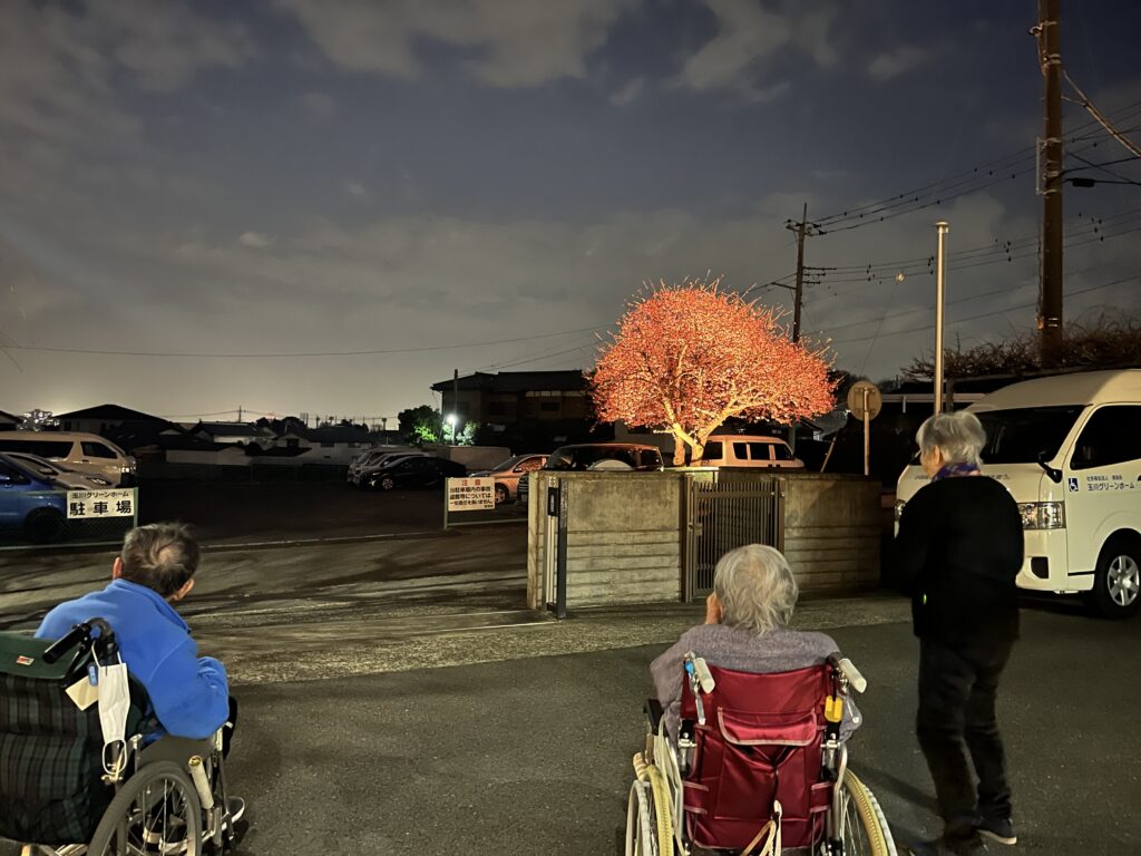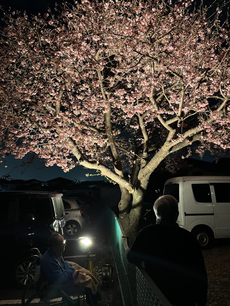 春一番も吹いて急に暖かくなりました。 玉川グリーンホーム駐車場にある河津さくらも 日に日に開花が進み 24日 夕方には 八分ほど咲きそろいました。 理事長が急遽ライトアップの準備をして下さり 外に出て お花見を楽しみました。 桜を笑顔で見上げるみなさん。 月もきれいに見えて いました。 桜を見ると嬉しくなるわね と お話しされて 周りの方がおおきく 頷いていらしゃいました。 たのしみな季節がはじまりました🌸