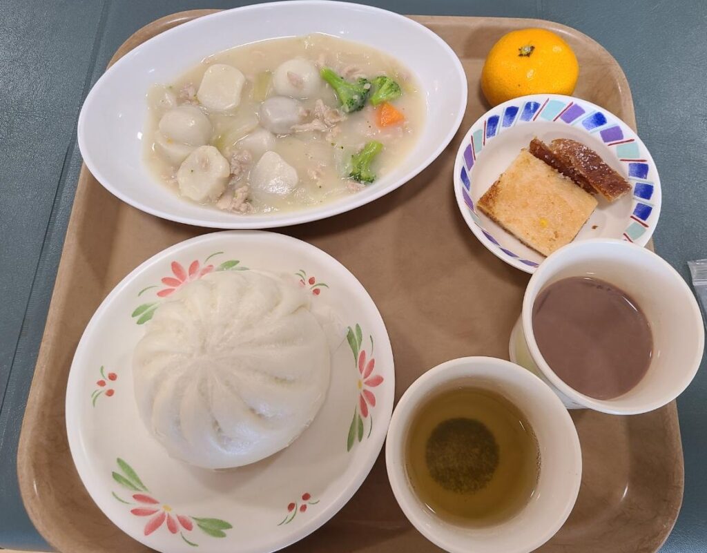 肉まんです♬ 冬になると、コンビニでよく買いましたね~。小鉢は揚げたトーストに、エビのペーストが塗られているそうです。