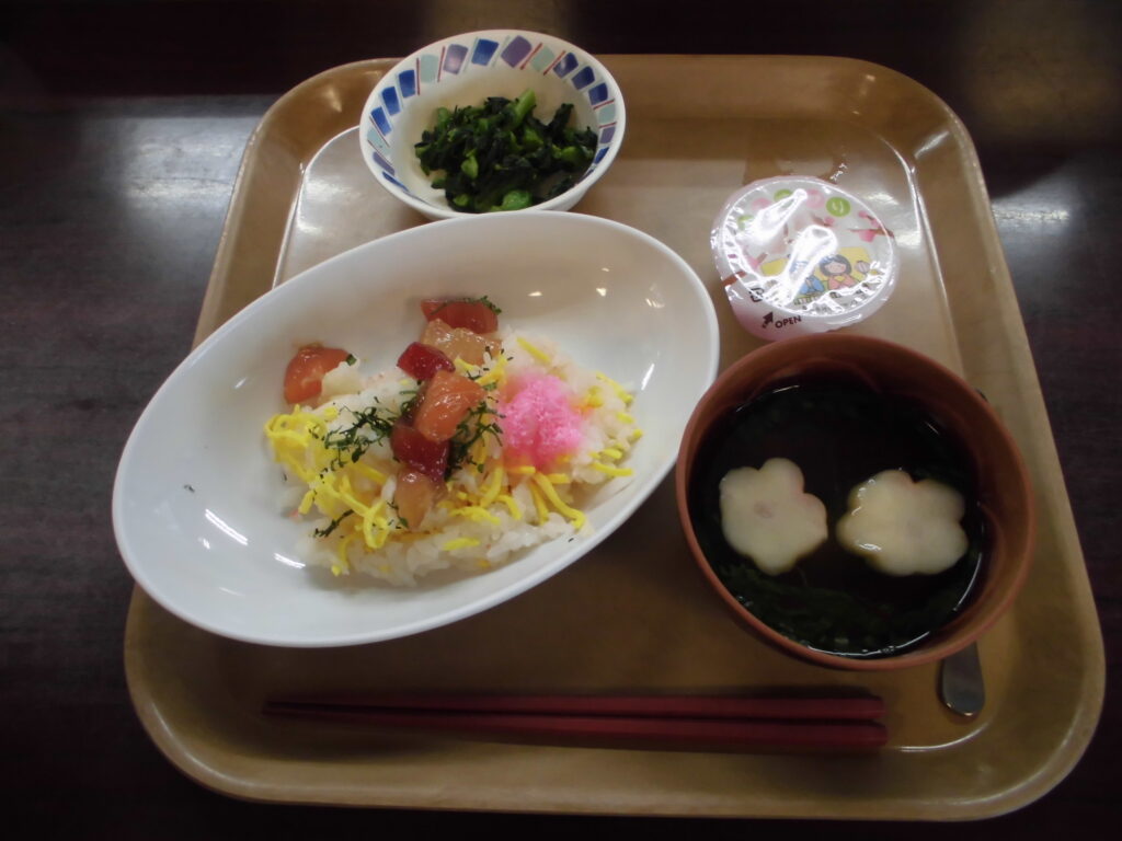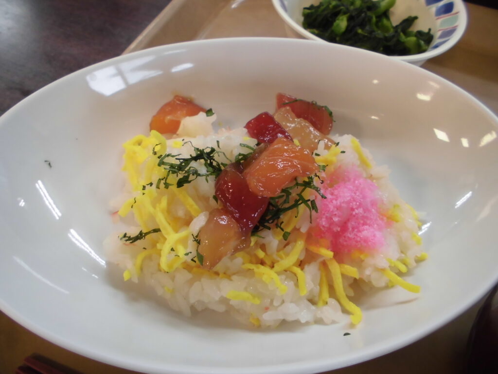 本日は、ひなまつりメニューで、“ちらし寿司”です💗 ご高齢になると「家で一人分はなかなか作らないから、食べられてうれしかった」と喜んで頂けました。