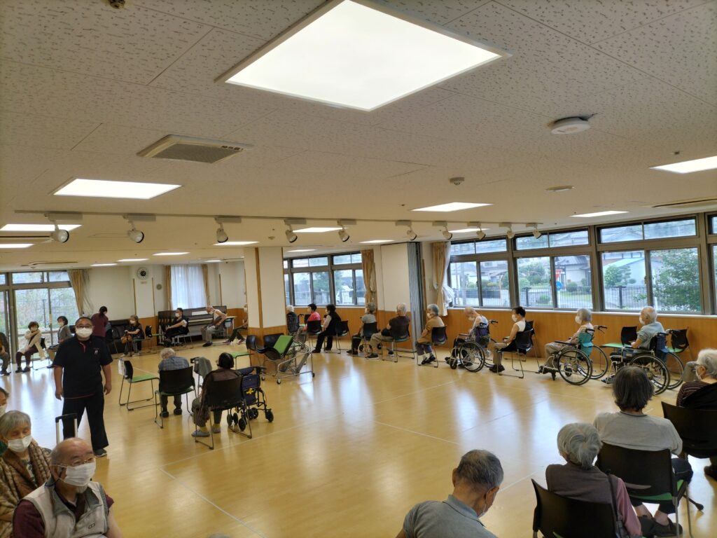 いつもラジオ体操や、レクリエーションを行っている交流スペースで、集団での予防接種になります。