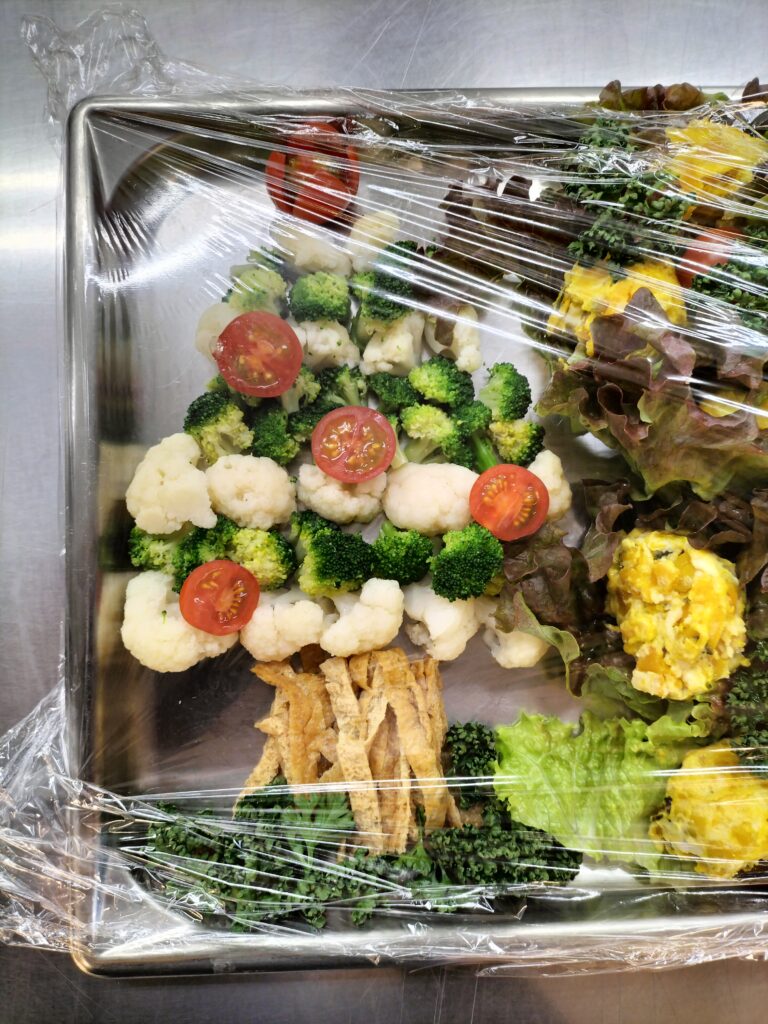 中央のブロッコリーはクリスマスツリーに見立てています。クリスマスカラーでとっても鮮やかですね~🎄