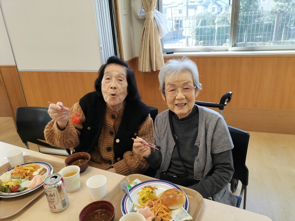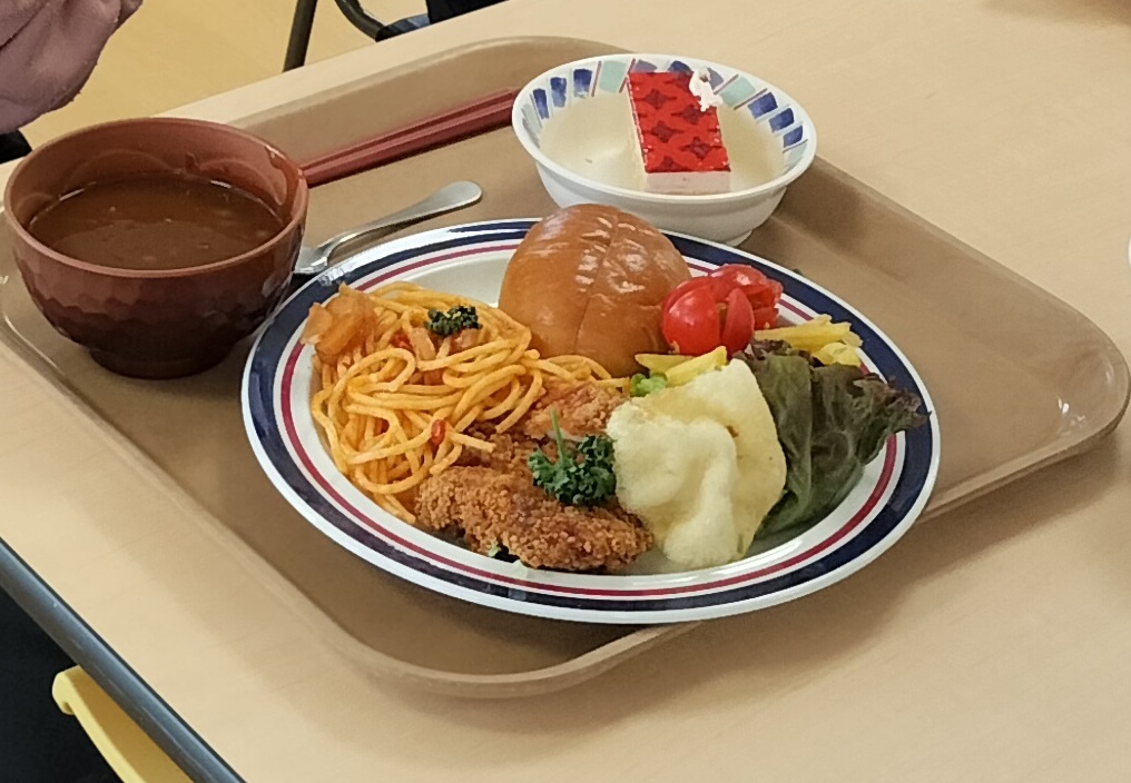 【メニューご紹介🍴】・バターロール・ポークシチュー・チキンカツ・かぼちゃサラダ・えびせん・ケーキ・ナポリタンスパゲティ・フライドポテト