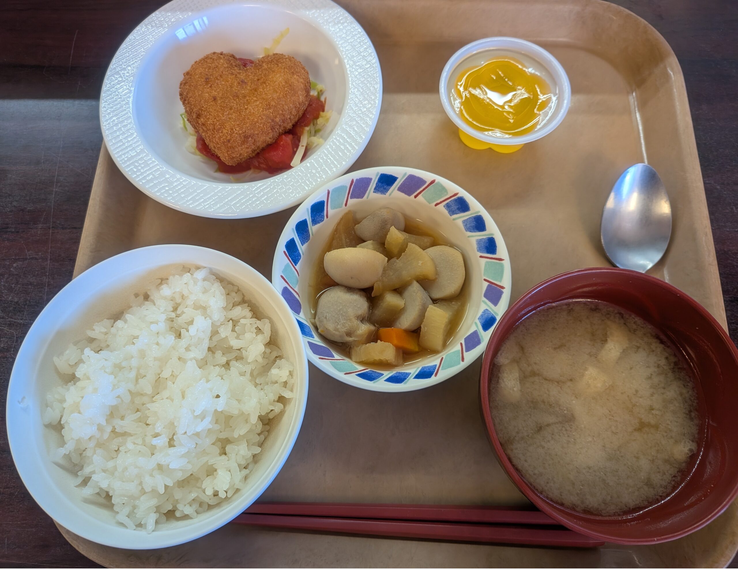 令和8年3月14日(土) 今日はホワイトデーです💕 小町山では厨房さんから愛のこもったプレゼントです~。 ハート形のコロッケに下にはトマトソースが敷かれています。 みなさんが参加している朝礼(ラジオ体操)でバレンタインデーとホワイトデーのお話を致しましたが、そこまで流行っていなかったのか、あまり反応はなかったんですが・・・ なにしろ“かわいい!”という事だったそうですよ。“揚げて美味しい”、“見て美味しい”で、😋好評でした!