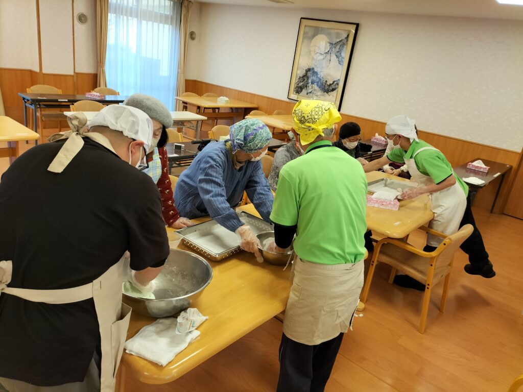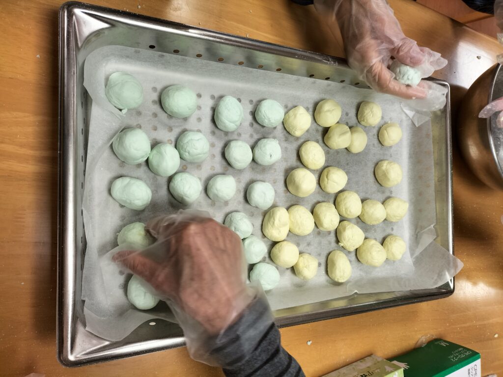 なかなか、こねるのに力が要ります💦 みなさん、どんどん丸めて頂けるので、職員も急いで次の生地をこねます!!