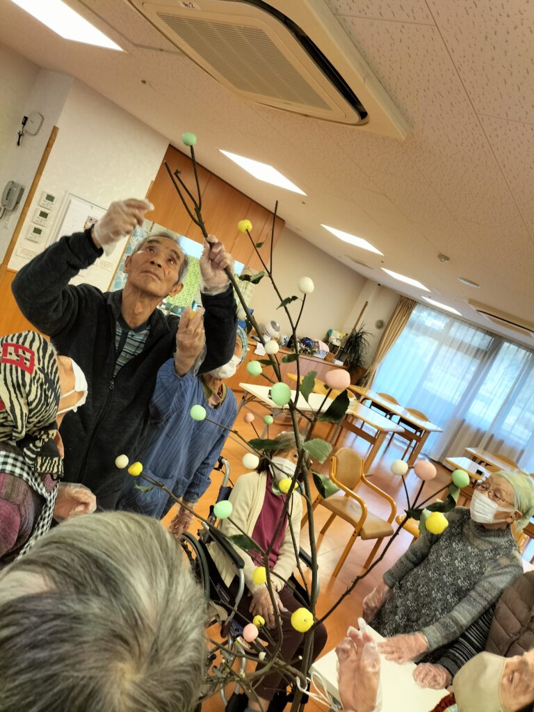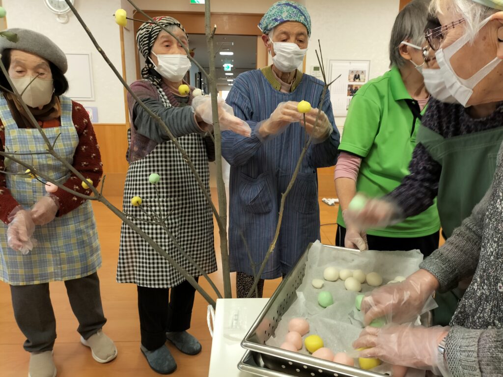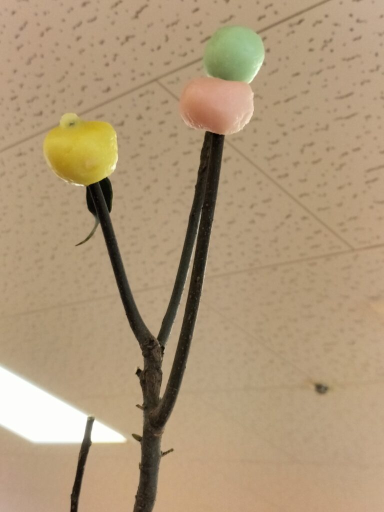 緑、黄色、ピンク、白の団子を作ります。厨房さんに、蒸してもらって、木に挿していきます。たくさんできました💗