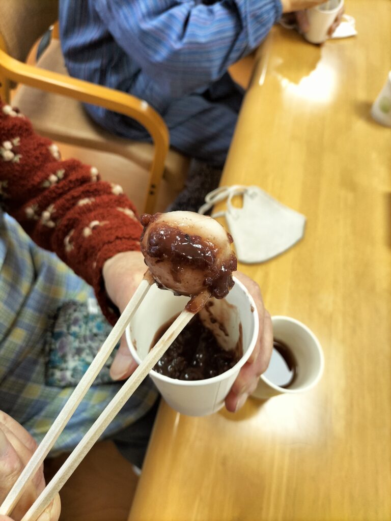 手の届かないところは、背の高い方に挿して頂きました。さすがです~👏 ご参加頂いた方々には、ほうじ茶と一緒に試食して頂きました!!やった!あんこ付きですよ~。あんこはとても、なめらかで食べやすそうでした。ちょうど15時頃で、おやつにはとっても良かったですね♬