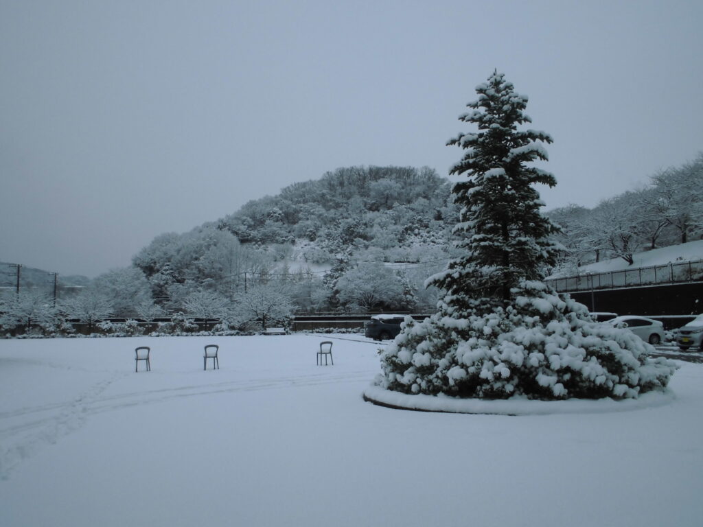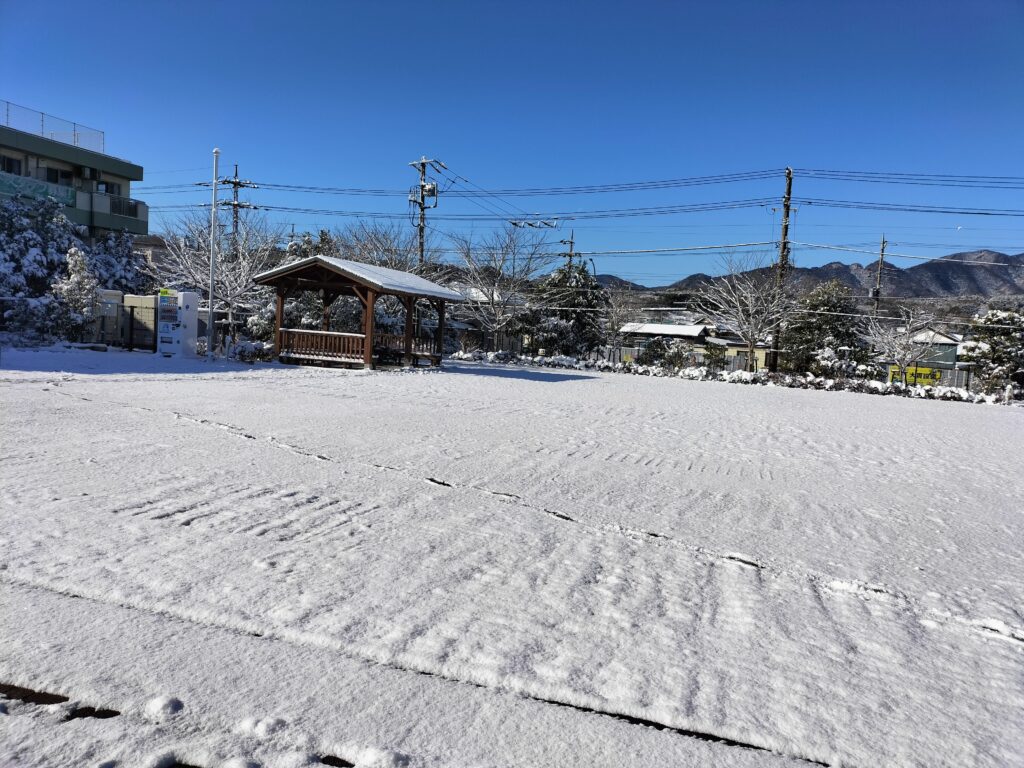 🐇翌朝の風景です。一面白くなったグランドは、まだ人の足が入っていないので、とてもきれいですね。近くの山も真っ白です。