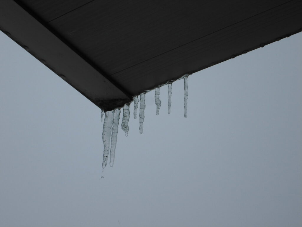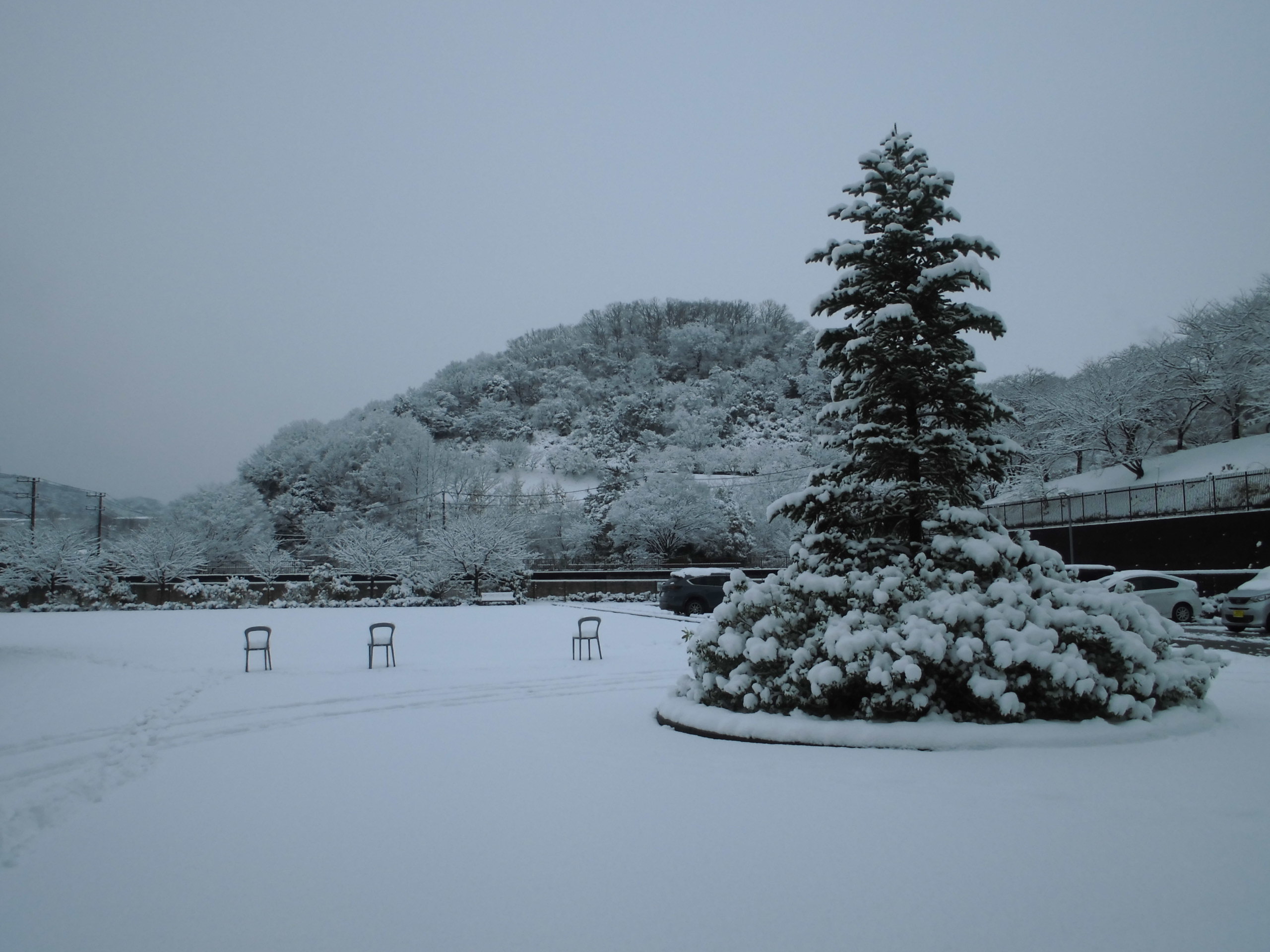 シンボルツリーも雪化粧です。ツララまで できてます。相当寒かったんですねぇ。頭に刺さらないように注意ですよ~!