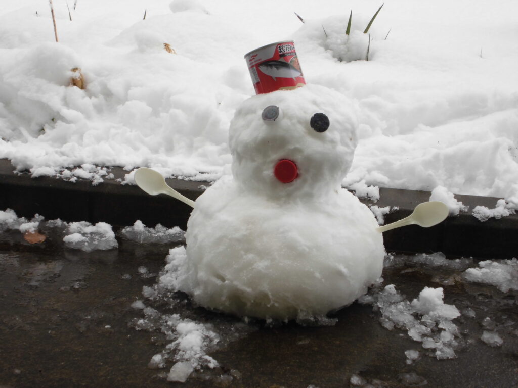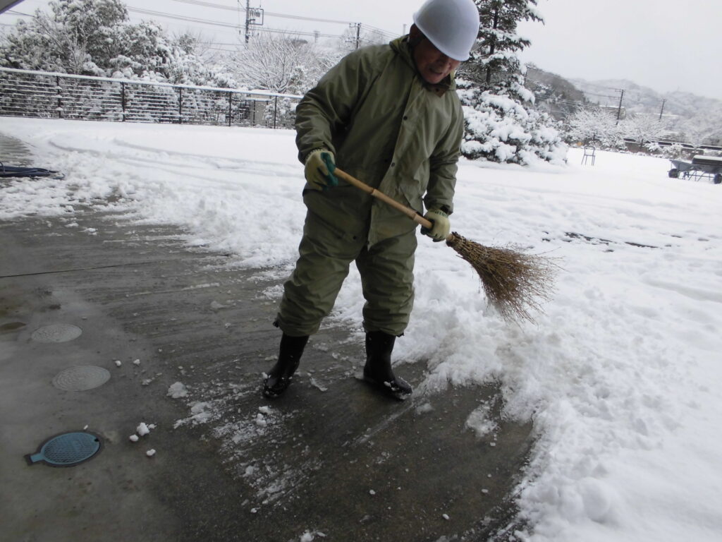 (左)さば缶の帽子を被った雪だるまもかわいいです♪職員が作ってくれました。(右)ご利用者様が雪掃除を手伝ってくれています。すごい!職員、負けちゃいますね~💦