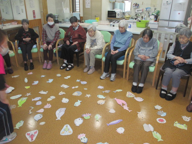みんなで魚つりゲームを楽しみ、釣った魚の裏側にお題があるので、