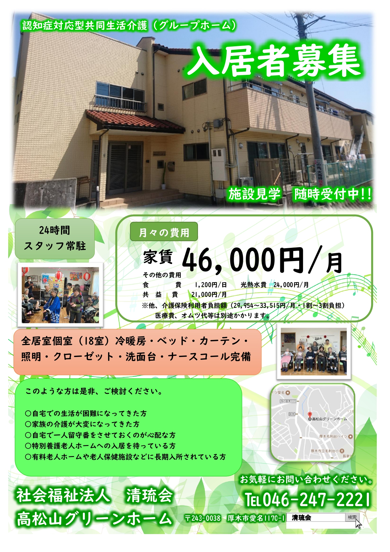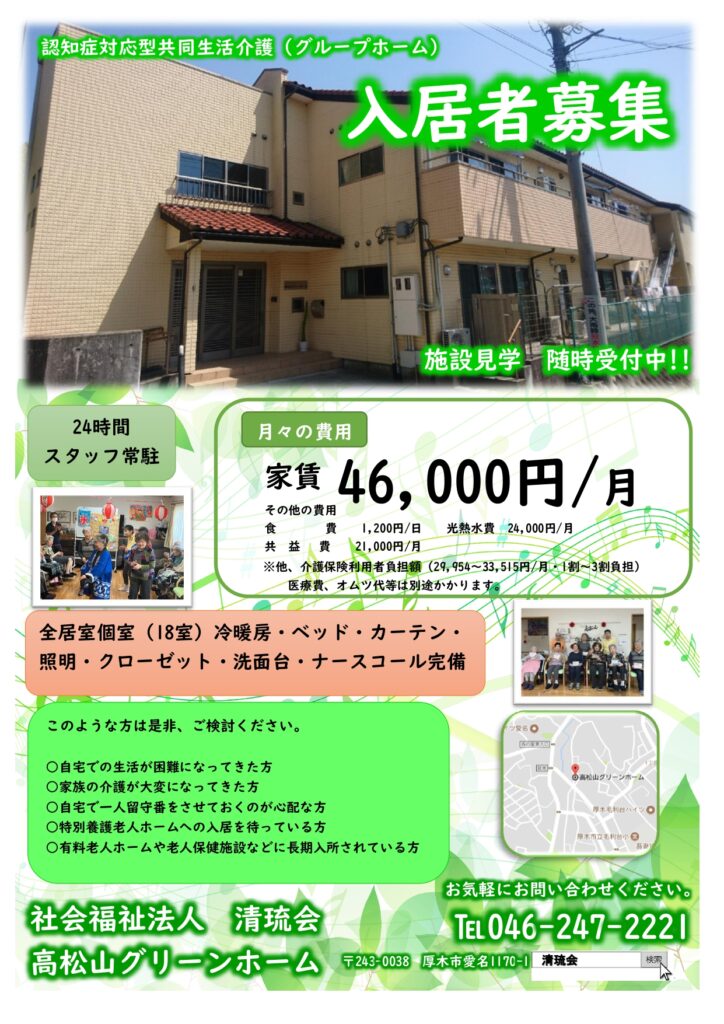 ただいま、お部屋が空いております。契約が済めばすぐに入居可能です。 見学・相談も随時受け付けておりますのでお気軽にお問い合わせください。お待ちしております。 担当:井上(連絡先:046-247-2221 e-mail:takamatsuyama@seiryukai1989.com)