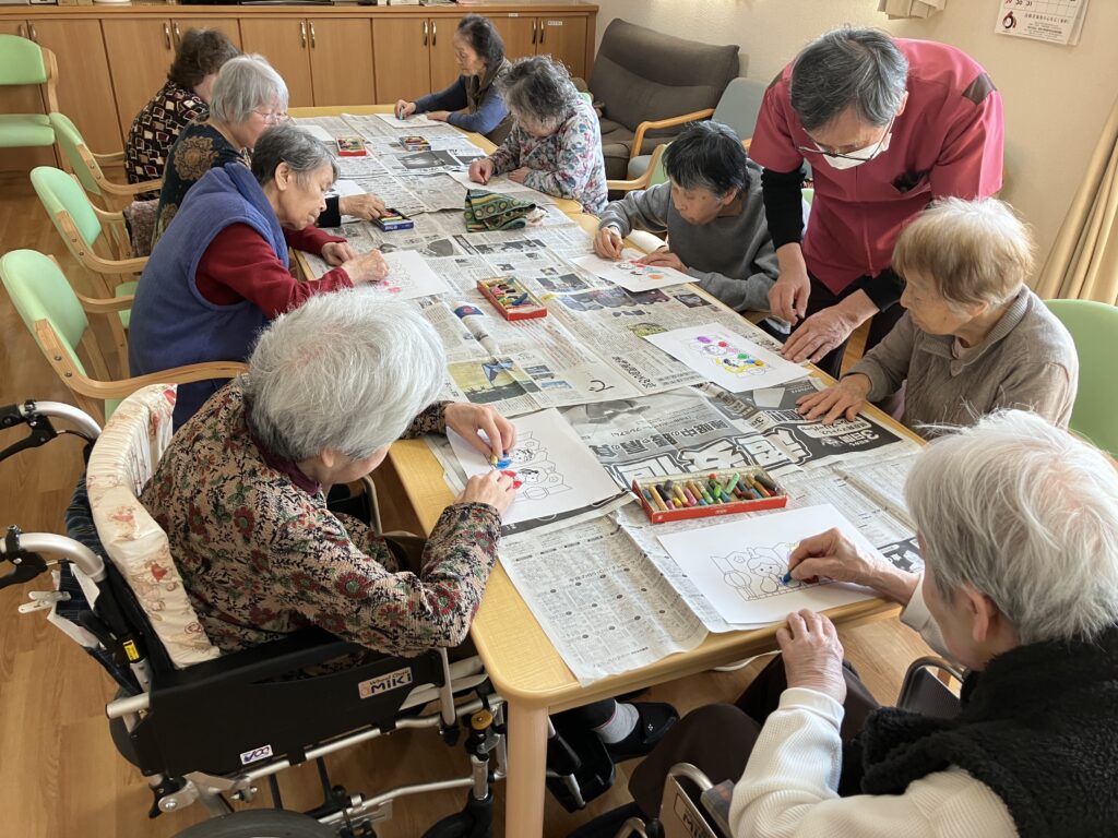 2月23日(月・祝)午後より落合医院:片山先生指導による臨床絵画が行われました。今回は3月3日のひな祭りが近いということでひな人形のぬり絵を行いました。同じ題材ですが、ぬり方や使う色も様々で個性があり面白い作品が出来上がりました。